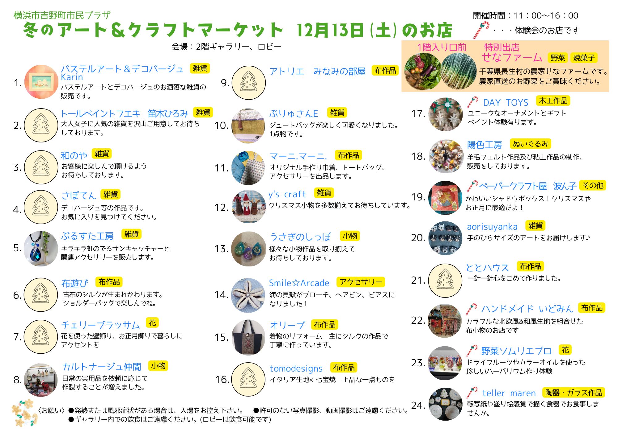 【出店数】 12月13日(土) 25ブース *特別出店 野菜・焼菓子販売「せなファーム」