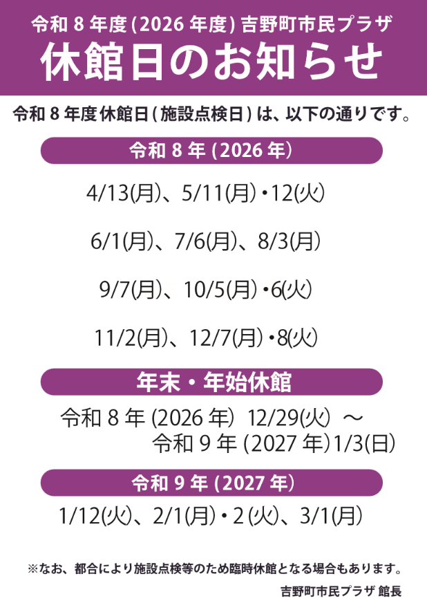 令和7年度(2025年度)・令和8年度(2026年度)休館日