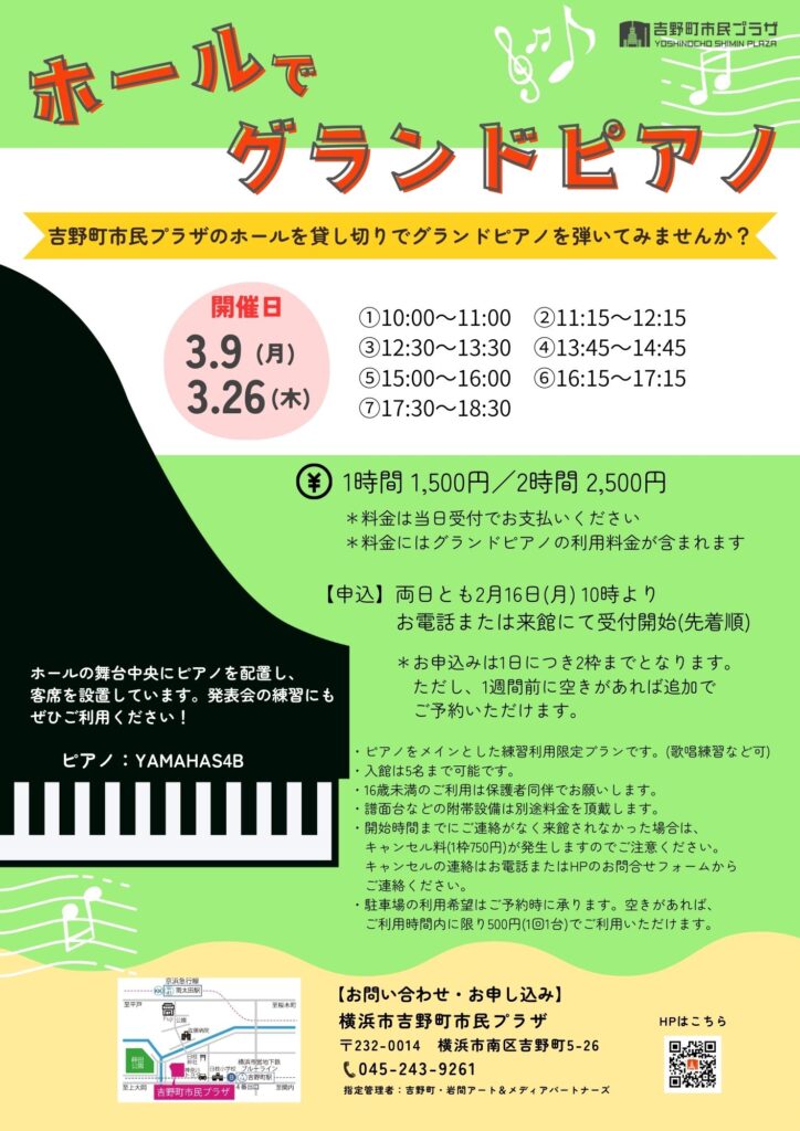 3/9(月)、3/26(木)開催 ホールでグランドピアノ